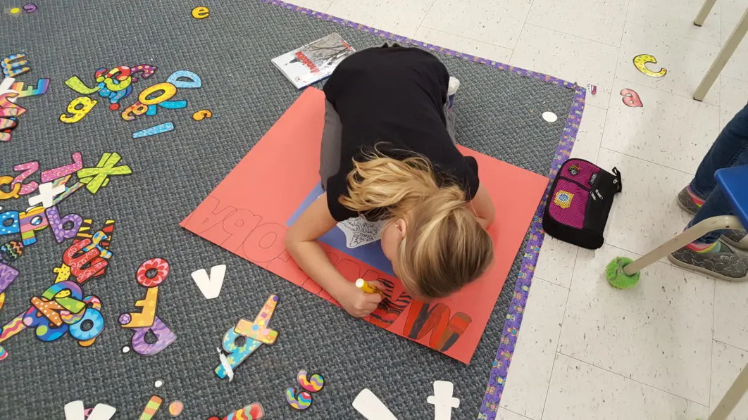 Next students were taught how to create a bold and eye-catching title. They traced letters from stencils, and coloured and outlined them brightly on their posters.