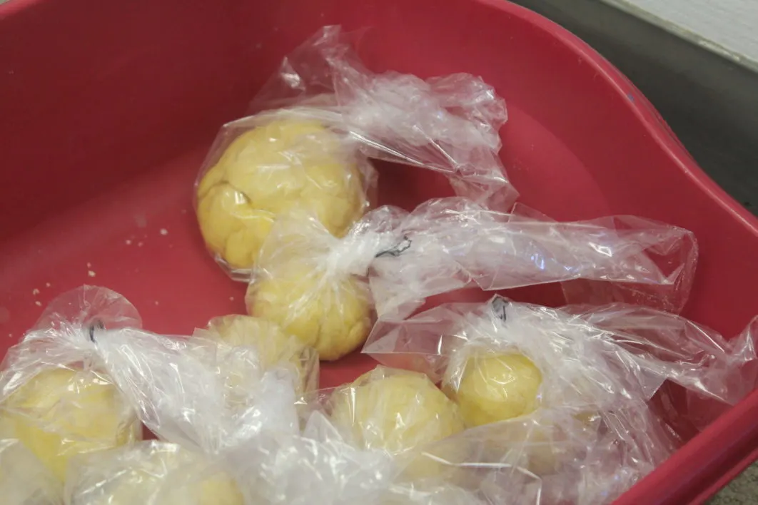 Students first learned how to make traditional Italian dough, from Northern Italy. They had to mix dry ingredients together, make a circular trench in the middle, add eggs and olive oil, and mix everything together by hand. Then students spent time kneading the dough until it was the right consistency, rolled their dough into a ball, and finally set it aside in a baggie to rest until we would resume our activity the next day.