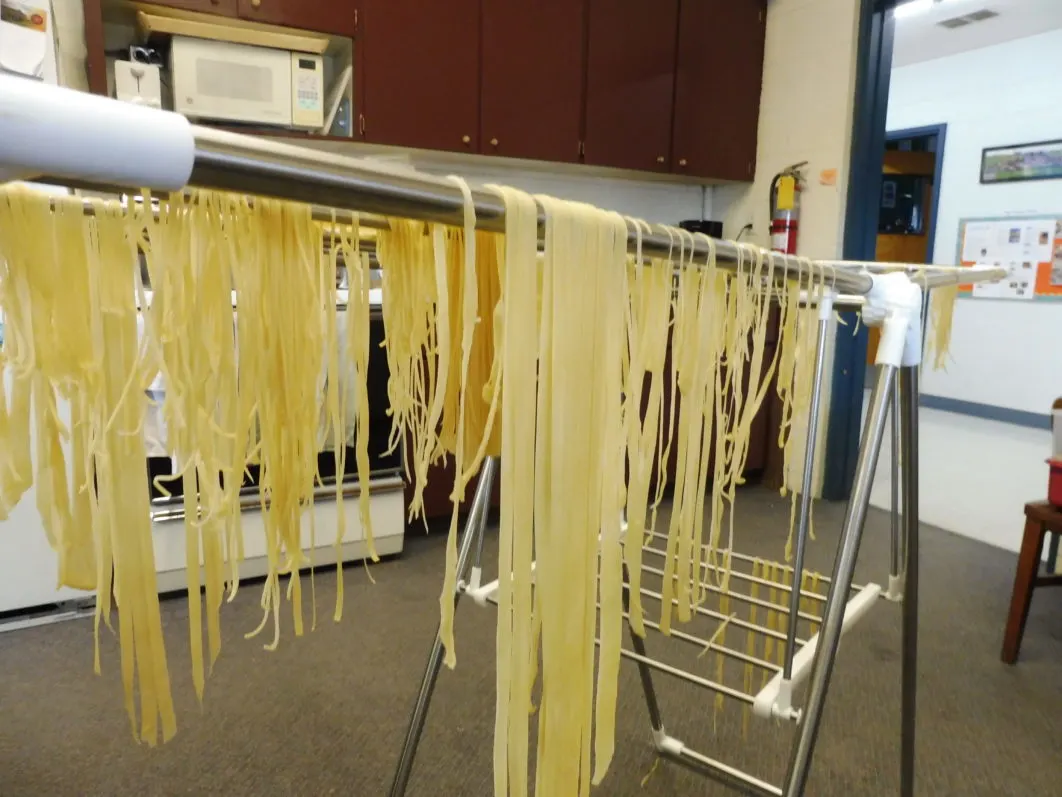 The next step in the process involved flattening the dough with a machine (multiple times until it was almost paper thin) and then feeding the thin dough through a separate apparatus which cut the dough into noodles (either linguine or spaghetti). Students would then either separate the noodles from each other or use extra dough to hand-cut little bowtie pieces of pasta (called farfalle).