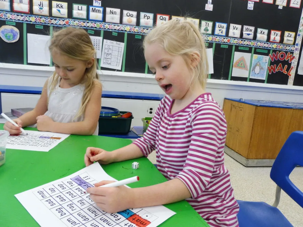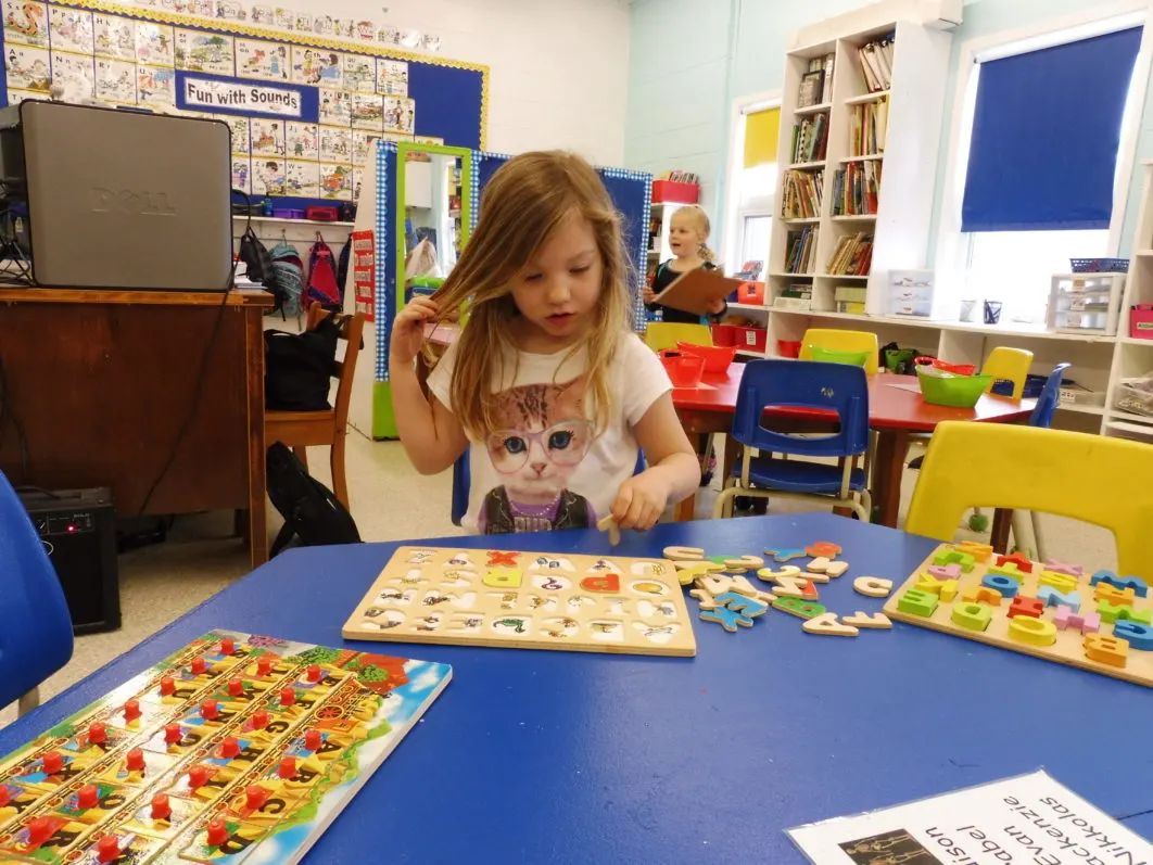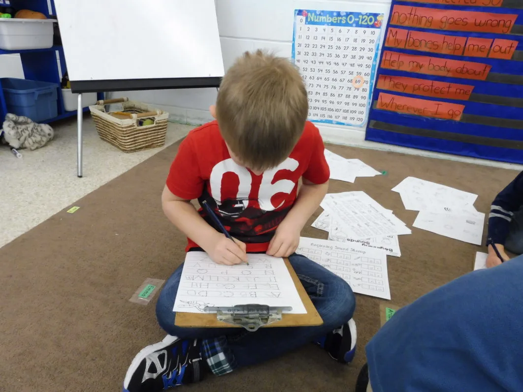 The Kindergarten students were busy working at alphabet centers. Some were learning to read three letter words, some were practicing printing the alphabet and some were figuring out the beginning sounds of words. Everyone was hard at work, learning at their own level.